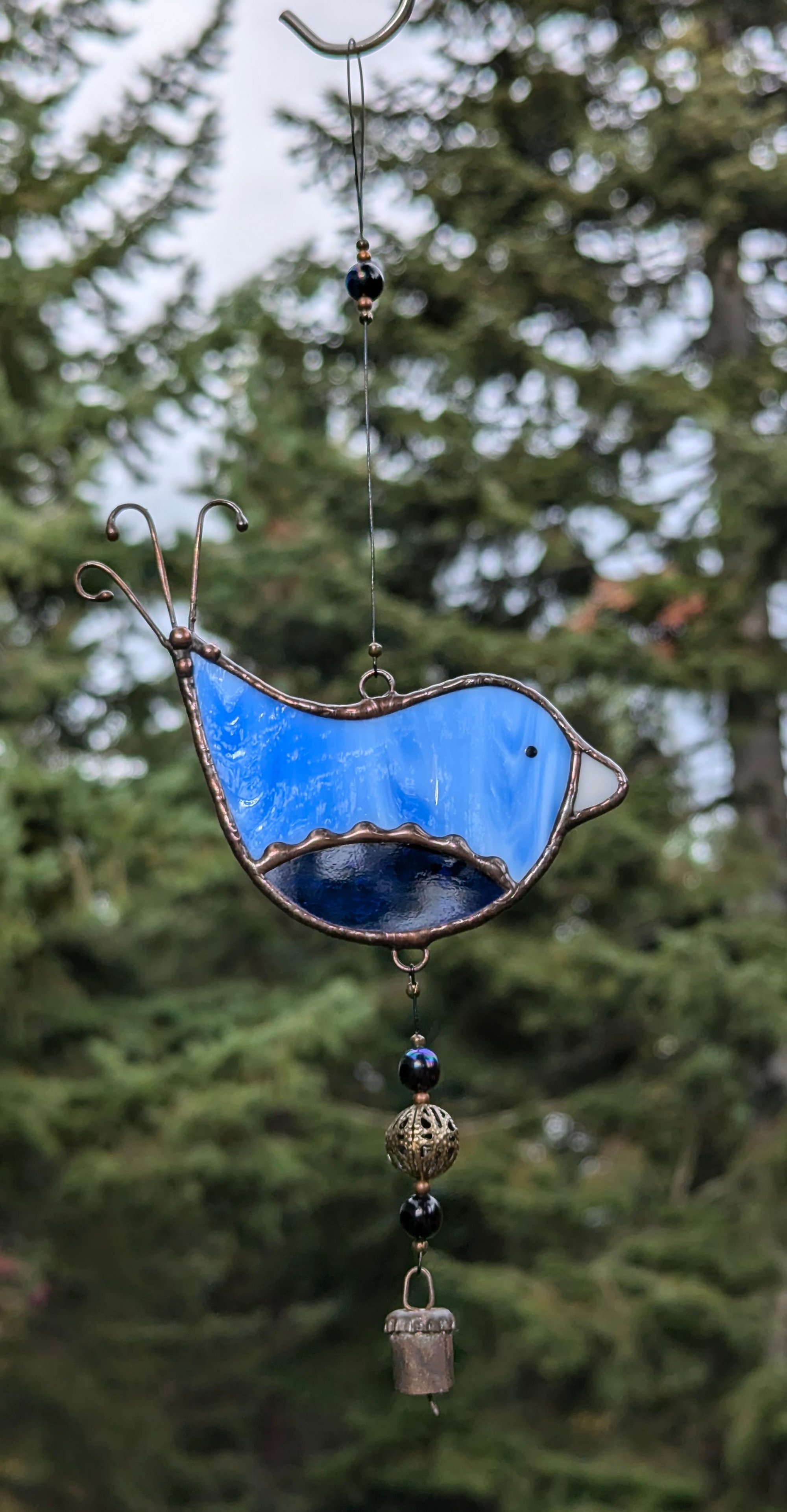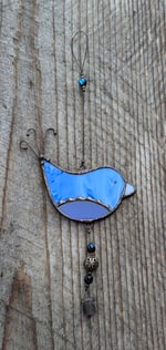 Complementary beads are strung on a sturdy nylon-coated stainless-steel wire, and a small bell adds a charming finishing touch. Place it in a sunny window to enjoy the light show that will dance through your little bird. The upper half is composed of opaque, wispy blue and white glass, while the lower half features a darker, transparent blue with a white beak. The eye has been hand-painted and cured with glass paint. This piece is unique and will bring a special touch to your space as the light changes throughout the day.
