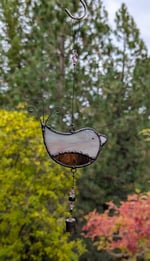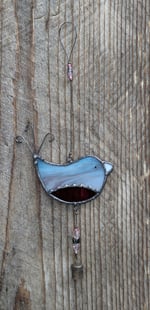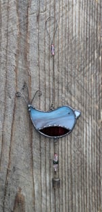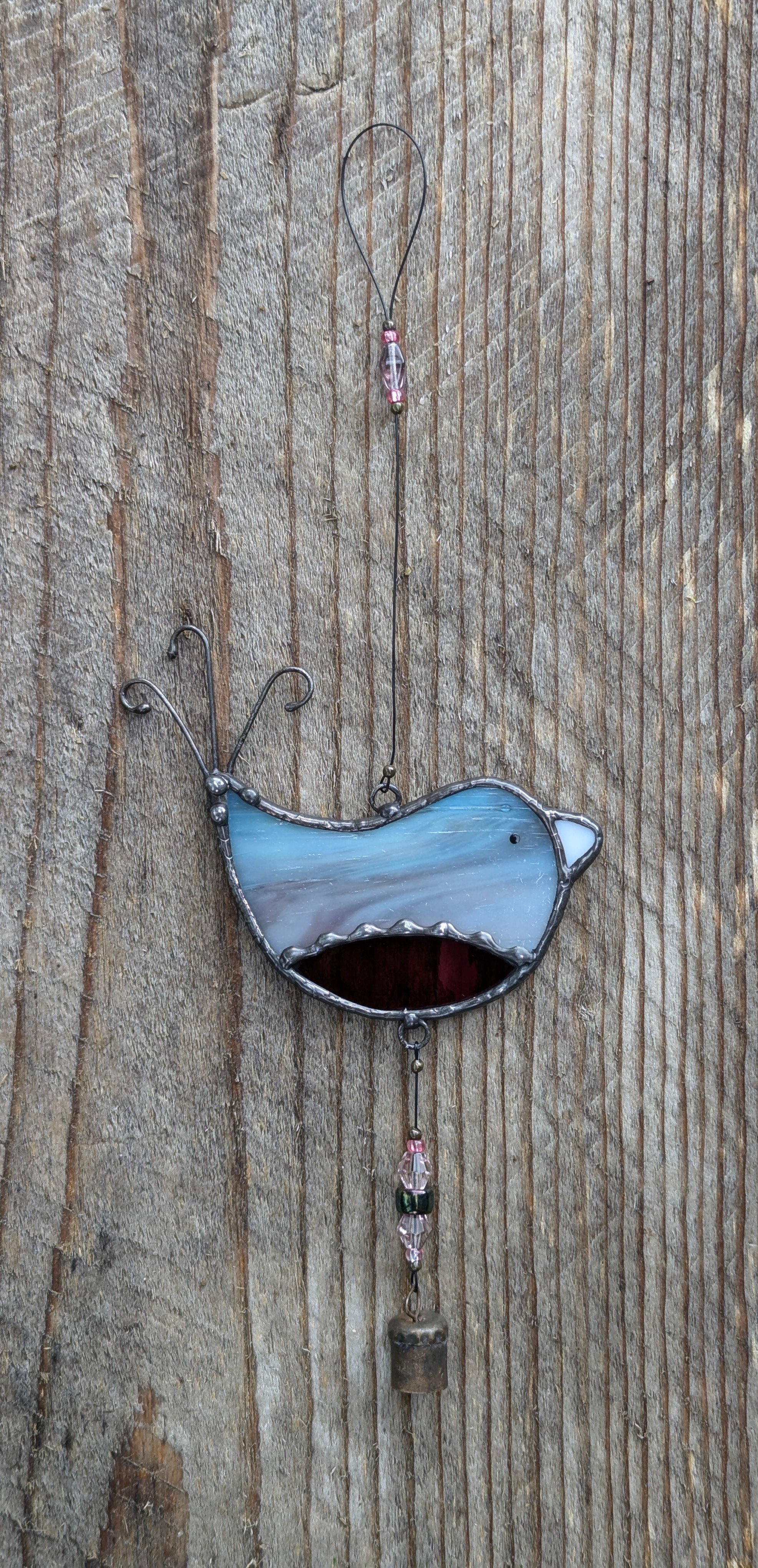 "Bonita" derives her name from the Spanish word meaning "pretty" or "beautiful," which she truly embodies. Her upper body features an opaque glass of light teal, white, and plum-colored swirls throughout. The lower part is crafted from transparent plum colored stained glass, and the beak is made from white glass. The eye has been hand-painted and cured with glass paint. Complementary beads are intricately strung on durable, nylon-coated stainless steel wire, and a small bell adds a charming finishing touch.